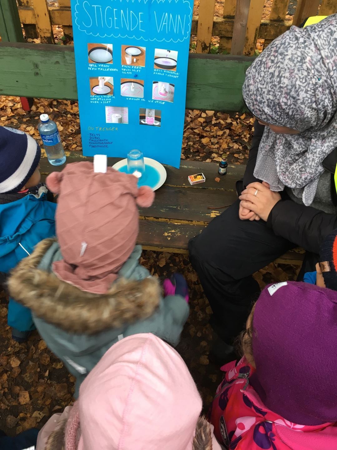Hver avdeling hadde valgt og forberedt en aktivitet knyttet til realfag. Barna fikk prøve seg på godterieksperiment, mønster i melk, stigende vann-eksperiment, og befri lekedyr frosset i is.