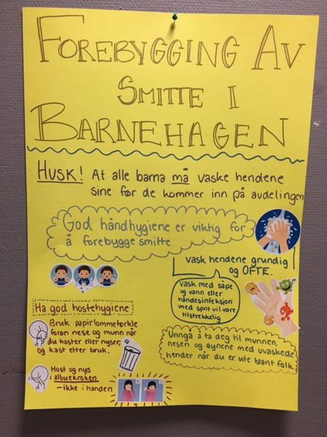 Vi har laget plakater og hadde en samtale med barna hvordan vi kan forbygge smitte i barnehagen.