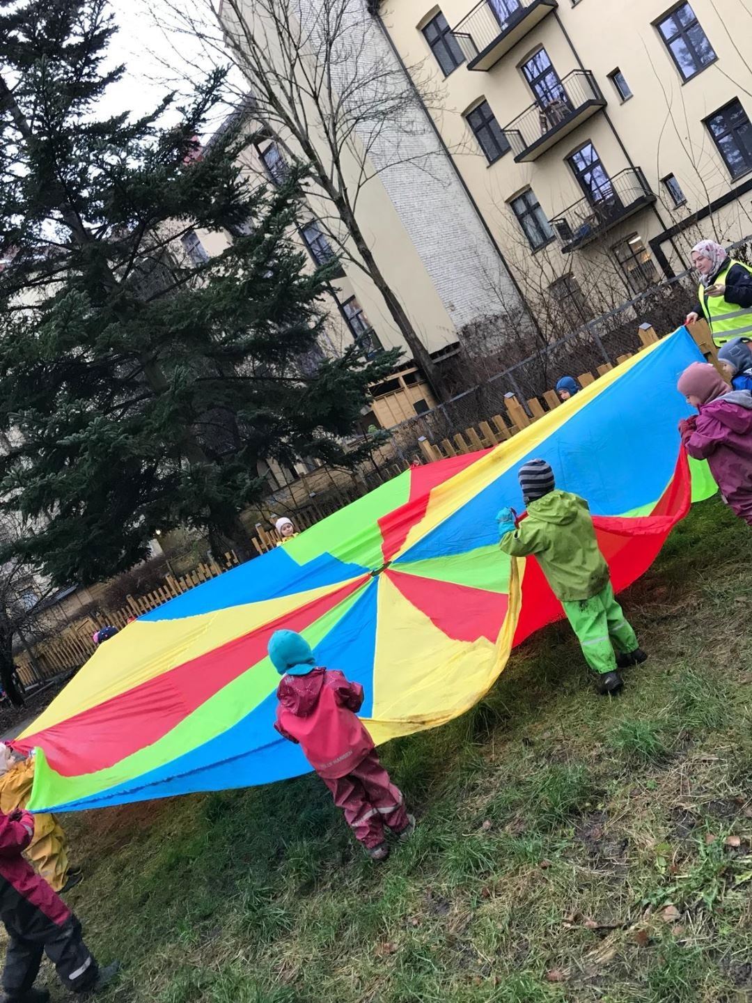 Utetiden foregår i kohorter. Det vil si at vi er ute avdelingsvis, og barna leker kun med barna på sin avdeling. I dag tok Regnbuen avdeling bruk fallskjerm, og barna syntes det var utrolig gøy✨